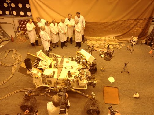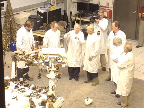Gov. Edmund G. Brown visited JPL yesterday and took a comprehensive tour of the MSL facilities, including the mission control and the instrument testing facility where he was shown a full-scale duplicate of Curiosity used for testing. Afterward, he addressed a pool of JPL employees.