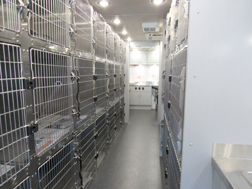 The converted RV is outfitted with cages and a medical section at the back of the vehicle. Faces of dogs decorate the outside of the RV. The mobile units will be driven throughout Los Angeles County to provide free or reduced cost spay and neuter surgery for cats and dogs.