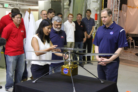 Helicopter project manager MiMi Aung explained the helicopter will fly in front of the rover and map the area. It will be able to go over terrain that is too difficult for the rover, and will land back on the rover.