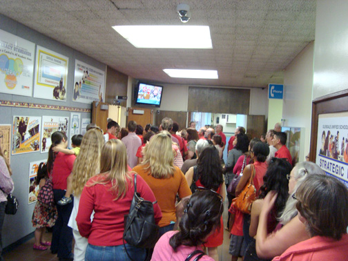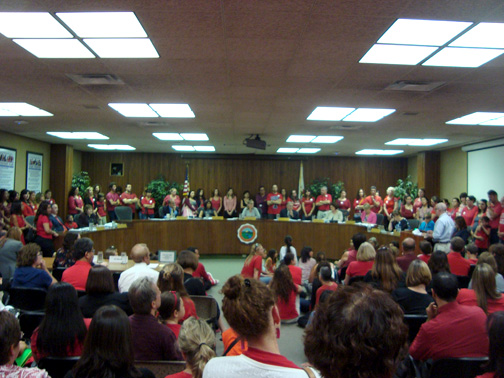 The chambers of the GUSD were crowded on Tuesday night with supporters of the Glendale Teachers Association.
