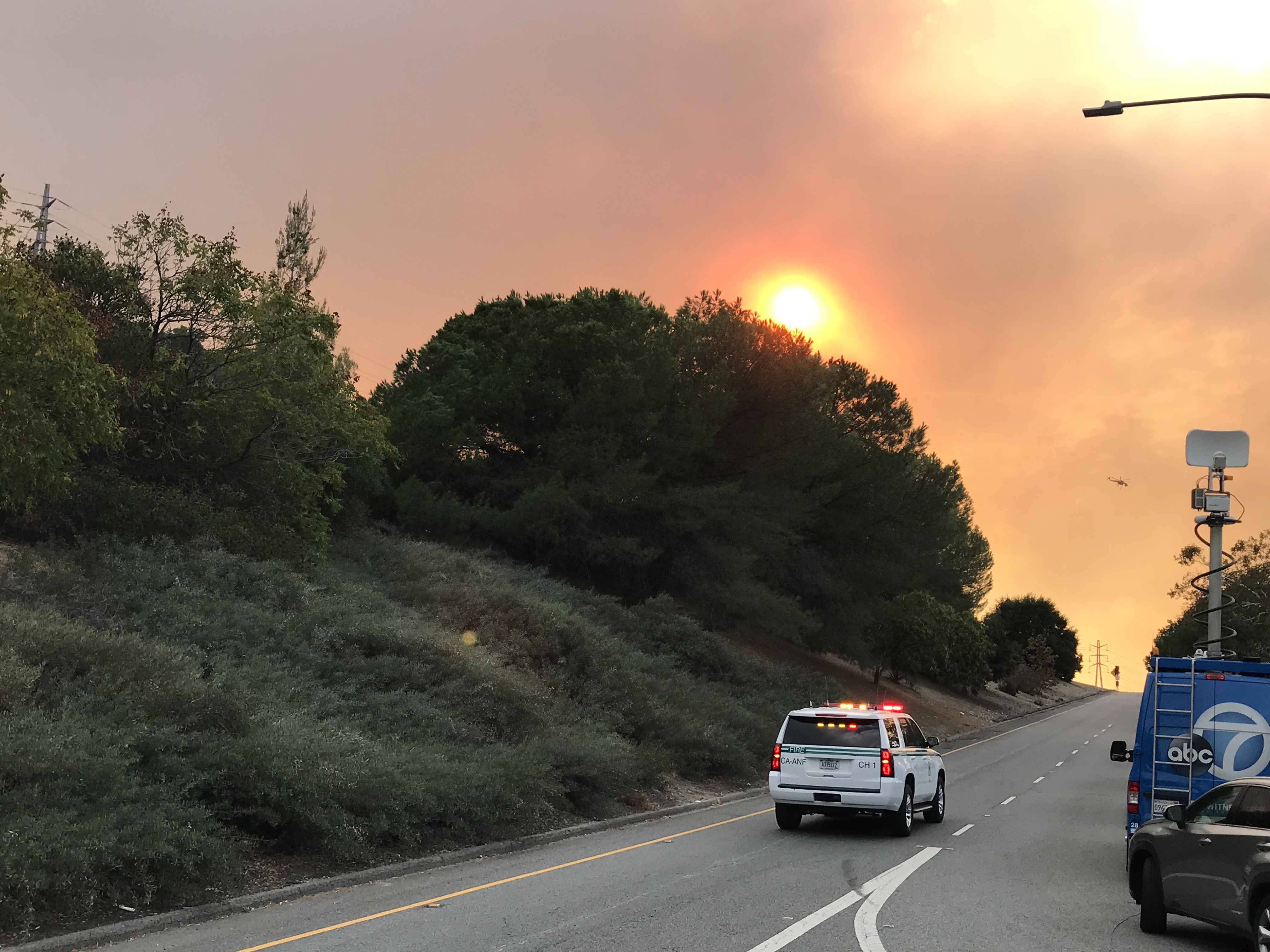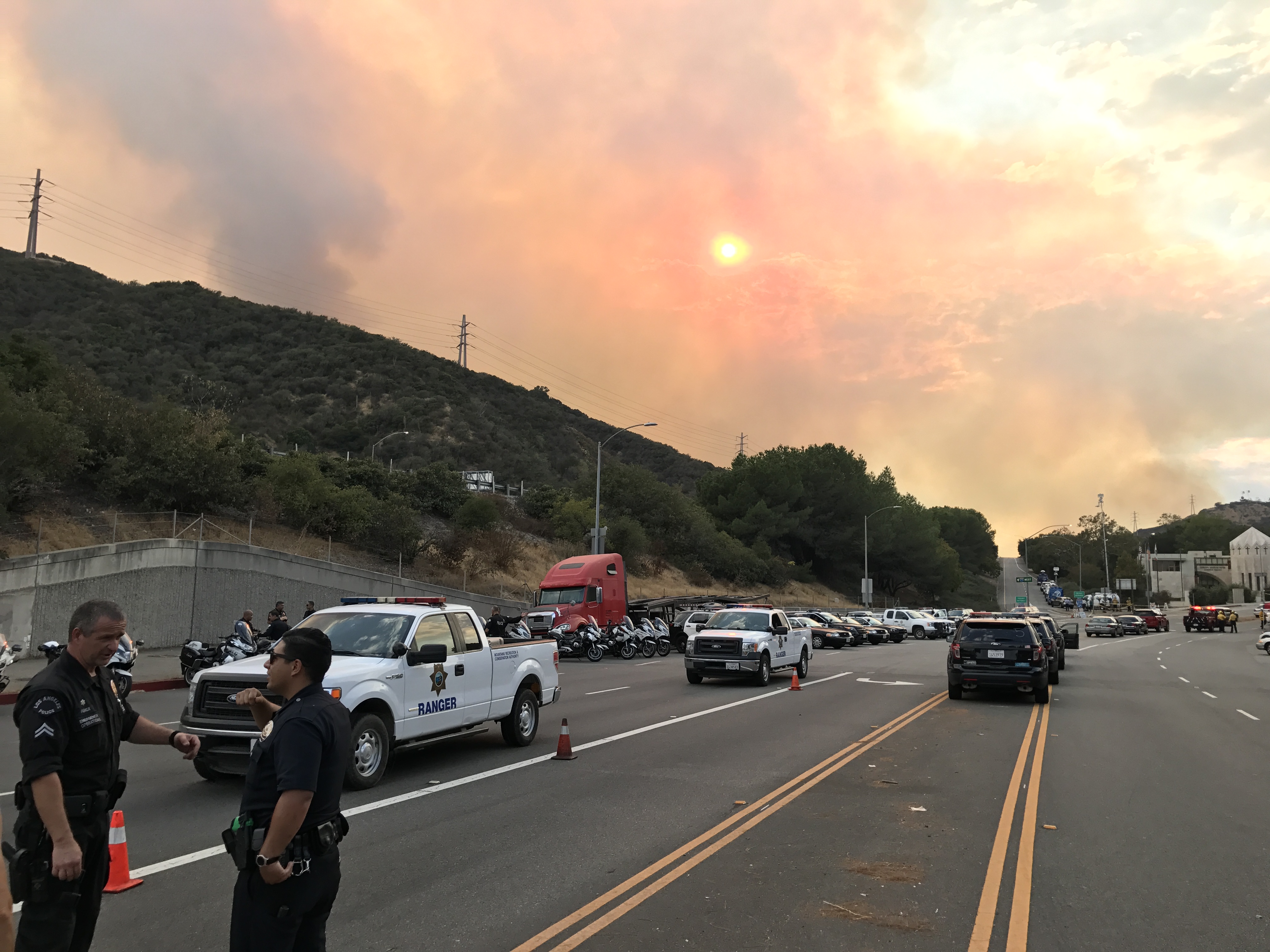 UPDATED 5:25 According to the City of Glendale, Glendale police officers are being held over and additional officers are being recalled. They are assisting the California Highway Police in shutting down on-ramps along the 210 Freeway in Glendale – all traffic is being turned around. Once on side streets, don’t expect to go anywhere fast. Best case scenario: don’t even think about driving through the area. A very large air attack (water drops) is being brought forth by allied agencies. The fire has made it to the top of the Verdugos.