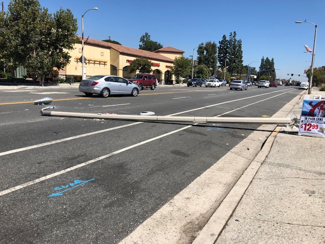 About 2 p.m. this afternoon a truck was attempting to back out of a driveway just west of Christie’s Liquor in the 3000 block of Foothill Boulevard when it hit a light pole. The light pole fell across the two eastbound lanes of Foothill Boulevard. The two eastbound lanes on Foothill was closed due to the accident. There is no estimate as to when the lanes will be open lawn. There were no injuries reported.