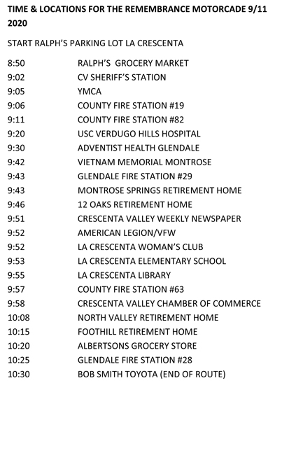 Since 2020 is unlike any other year, some changes had to be implemented to the motorcade while still continuing to recognize Patriot Day and first responders. On Friday, a reduced number of classic cars and hot rods will be making their way through the Crescenta Valley. There will only be 40 vehicles this year, and although the motorcade will pass by three elementary schools, it will not be driving past any other schools. It has also added USC Verdugo Hills Hospital and Adventist Health Glendale to the route.