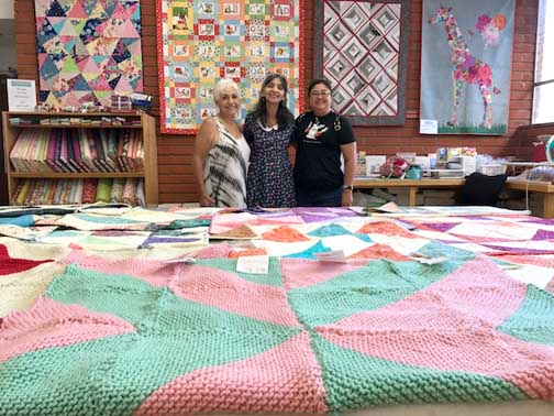 Quilt ‘n’ Things owner Lana Norton, center, with Anna Marie Messerly (left) and Chieko Minohara-Biligan, supported the Welcome Blanket project and opened her store for artisans to work on their projects.