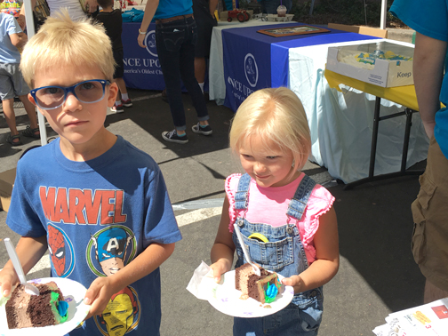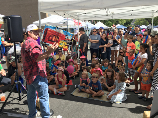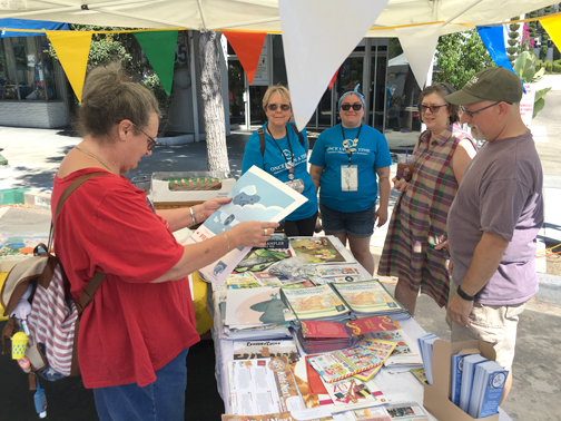 Children and book lovers of all ages filtered in and out of the booth throughout the morning to peruse the selection of books and free promotional materials from publishers, despite the sweltering temperatures in the 90s. As the day progressed, several celebratory cakes were cut and pieces passed out to well-wishers and friends. At 1 p.m., a crowd of children and parents assembled for story time by renowned children’s book author, David Shannon.