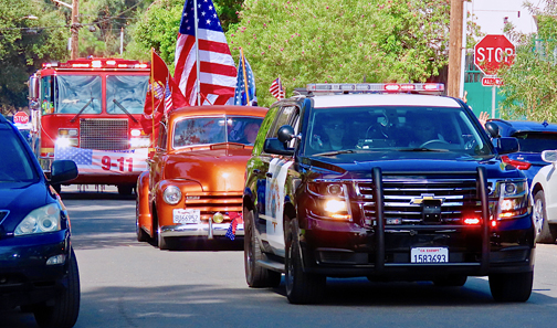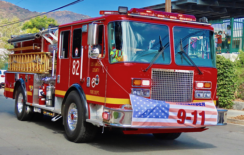 The bells of St. Luke’s of the Mountains Church rang out when the motorcade procession began from the Ralph’s Market parking lot at 8:46 a.m., the time that the first hijacked commercial plane struck the North Tower of the World Trade Center. The 50 cars in the motorcade then proceeded along a planned route, with California Highway motorcycle patrol units securing traffic safety. The motorcade included antique cars as well as police, fire, military and search and rescue vehicles.