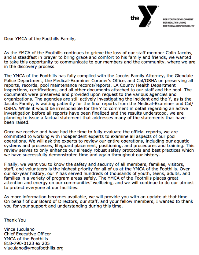 In recent weeks the family of Colin Jacobs, 19, has been calling attention to their complaints regarding obtaining information from the Crescenta CaƱada YMCA [YMCA of the Foothills]. In July Colin, an employee of the Y, drowned in the pool at the La Crescenta Y facility while working as a camp counselor. Family members stated they had questions concerning the day Colin drowned and felt Y representatives were not responsive to their questions.