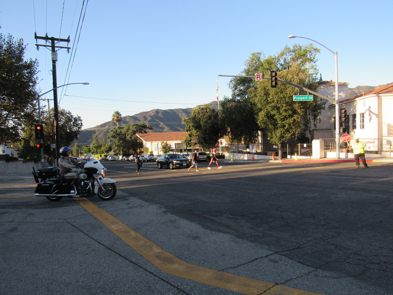 Students wait at Los Amigos Street and Rosemont Avenue to safely cross with a crossing guard under the watchful eye of a CHP motorcycle officer.