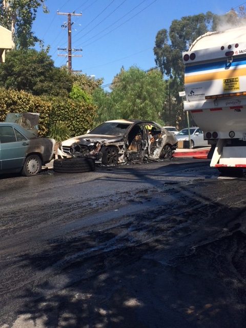 At approximately 9:45 this morning (Monday) in the 3100 block of Montrose Avenue, a City of Glendale trash truck driver detected a small fire under the body of his truck. He immediately stopped the vehicle and attempted to extinguish the flames with a fire extinguisher. Unfortunately he was unable to and he called 9-1-1. Glendale Police Dept. and the fire department quickly responded. Upon their arrival, they discovered he truck was fully engulfed, causing the tires to explode. It appears that two other vehicles were damaged; no one was reported injured. As of 10:39 the fire has been extinguished.