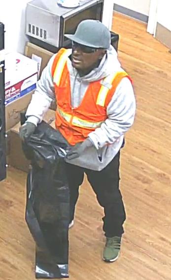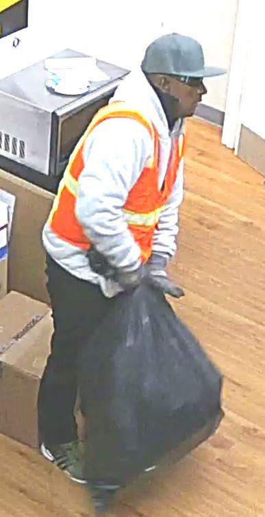 The male suspect is described as approximately 5’6” to 5’10”, 35-45 years old, medium build, dark complexion (possibly wearing dark make-up) and wearing a light gray hoodie, orange safety vest, jeans, green Adidas shoes and gray gloves.