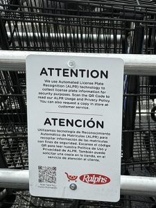 Shoppers at Ralphs Market may have missed it – a sign placed on the side of the cart return corral that states, “Attention. We use Automated License Plate Recognition (ALPR) technology to collect license plate information for security purposes….”