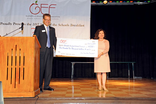 A check in the amount of $110,000 was presented to GUSD board president Nayiri Nahabedian by GEF president Eric Hamilton during the State of the Schools Breakfast.