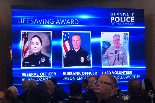 The Lifesaving Award recognized two police officers and a member of Los Angeles County Sheriff’s Dept. – Crescenta Valley Station, Montrose Search and Rescue.