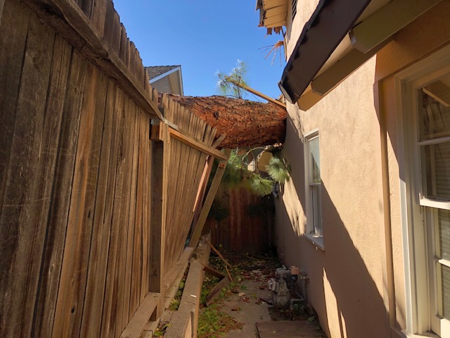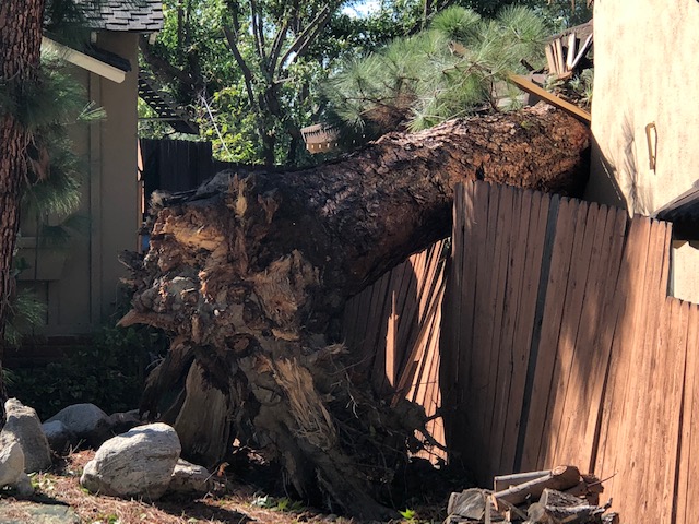 Strong winds toppled a tree on Janet Lee sending it crashing through a wooden fence that separated two properties and onto the roof of a nearby home. The Los Angeles County Fire Dept. assessed the home as having structural damage; fortunately, the residents can still stay in the area of the home not affected by the damage.