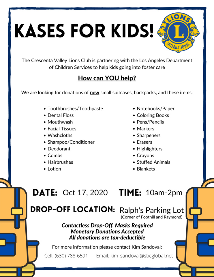 The Crescenta Valley Lions Club is holding its 12th annual Kases for Kids drive on Saturday, Oct. 17 from 10 a.m. to 2 p.m. in the parking lot of the Ralphs market in the 2600 block of Foothill Boulevard at Raymond Avenue. Members of the Leo Club, the youth arm of the Lions Club at Crescenta Valley High School, will be assisting with the drive as well. The Lions Club will be collecting donations of new items, such as backpacks, small suitcases, toiletries, school supplies, stuffed animals, and blankets, that will go into a backpack or small suitcase to help children in the foster care system transition to a foster home.