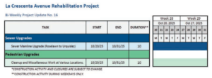 The revised schedule is due to unforeseen conflicts encountered during underground utility work and longer-than-anticipated lead times for the delivery of traffic signal materials. Installation and commissioning of traffic signal poles must be completed before paving and striping improvements can begin as the new striping layout incorporates additional crossings to improve pedestrian and cyclist safety.