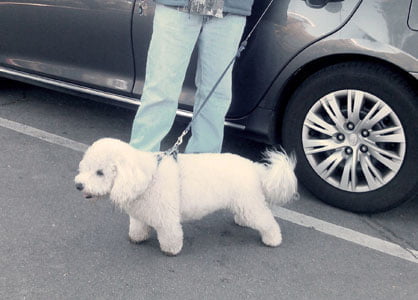 Charlie, a social poodle who is a regular at the CV Dog Park, strains at his leash to get to his favorite play place.