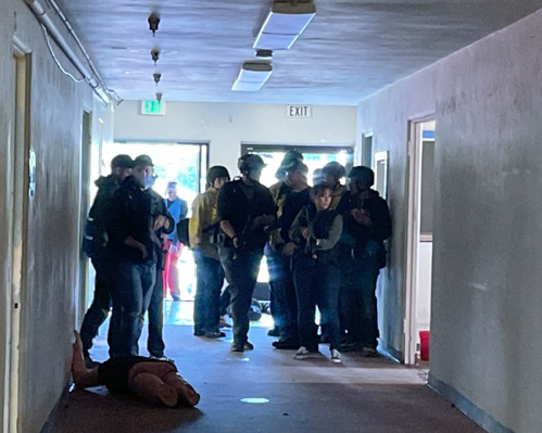 An empty building donated by Adventist Hospital was the training area. Several rooms were used to create the carnage that follows an active shooter incident. Glendale Community Emergency Response Team members volunteered to be victims. They, as well as prop (mannequin) victims, were placed throughout the building.