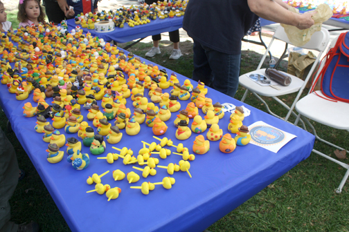 The splash is organized by the Kiwanis Club of Glendale that oversees the installation of a temporary “lake” on the park grounds provided by the Glendale Fire Dept. Over the course of several heats during the day, 20,000 ducks made their way down the watery course, each duck bottom stamped with an identifying number that correlated with the number on the duck’s adoption papers. Each of the ducks had been adopted during the last several months at an average cost of $5 each with the adoptions facilitated by local non-profits. The non-profits also received 50% of the proceeds of the adoption. The person’s name appearing on the adoption papers corresponding to the first ducks in order of finish at each of the six heats were awarded prizes.