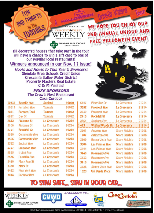Another drive-by option for festive fun is Fun and Frights in the Foothills “spooktacular” tour. Starting at dusk on Oct. 31, families may drive (or walk) past identified houses that have been decorated for the occasion. The tour is presented by Crescenta Valley Weekly with Glendale Area Schools Credit Union and sponsored by Property Masters Realty, CVWD and C&M Printing. The community map of participating addresses can be found on page 13.