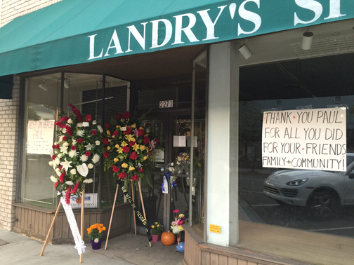 A memorial to Paul Roberts stands outside Landry’s Sporting Goods, which Paul’s family owned for decades.