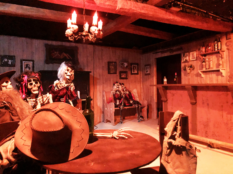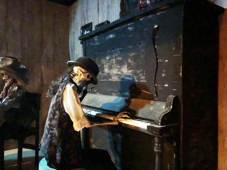 The skeletal remains of a piano player tickle the ivories in the saloon. This piano is made of cardboard joked Krohn.
