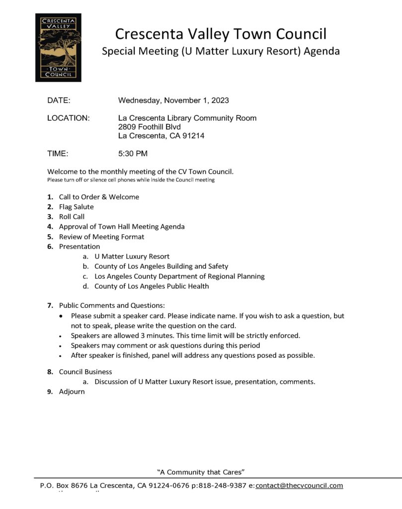 The Crescenta Valley Town Council is having a meeting on Wednesday, Nov. 1 at 5:30 p.m. in the community room of the La Crescenta Library, 2809 Foothill Blvd. in La Crescenta to discuss the business U Matter Luxury Resort located at Frances and Ramsdell avenues in La Crescenta.