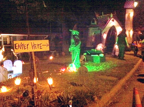 When Steve and I were first married, we lived in a back house on Lowell Avenue. To my utter disappointment, we had no trick-or-treaters. Same when we moved to the 2600 block of Altura. But when we moved to Mountain Pine (one of the few blocks north of Foothill Boulevard that has streetlights), I was again able to indulge my ghoulish tendencies. Our eldest son Patrick was as excited as I to create scenarios that would make even the seasoned trick-or-treater have second thoughts before approaching our door.