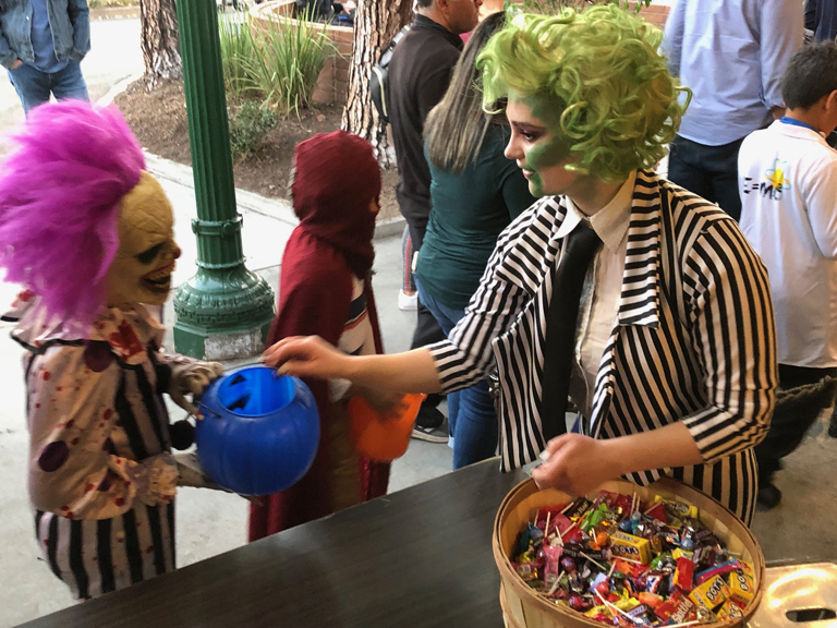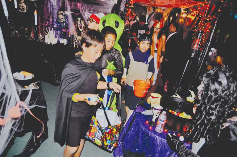 For the past six years, the Church of Scientology Mission of the Foothills has transformed itself into a haunted house for Halloween night. Grim reapers and witches greeted the line of trick-or-treaters, passing out candy and glowstick bracelets. The haunted house included a slightly spooky graveyard with roaming ghost, a toxic waste scene featuring ailing hazmat actors, skeletons and cute giant rats. The haunted mansion room was presided over by Gomez and Morticia Addams, along with many spiders and their giant spider traps, and the witch’s room featured potions and skeletal pets.