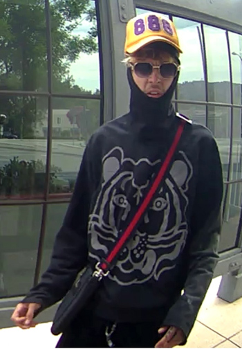 At the time he was wearing a yellow hat with “8 8 8” embroidered across the front, gold framed aviator sunglasses, a black neck gaiter, a black “Kenzo” tiger print sweater, black sweatpants, black shoes and carrying a dark gray Gucci satchel. The suspect also has tattoos on his left hand/fingers.