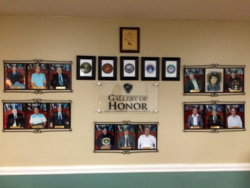 The veterans wall, titled the Gallery of Honor, includes photos of all of the resident veterans and is located where everyone in the retirement community can easily view and appreciate it.