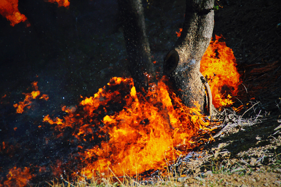 A burning tree during a prescribed burn under the supervision of the U.S. Forest Service.