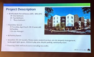 In addition, there is a residential aspect for Transitional Age Youth [TAY] of the development that would set aside 25 apartment units for people from 18 to 26 years old with juveniles as part of their family.
