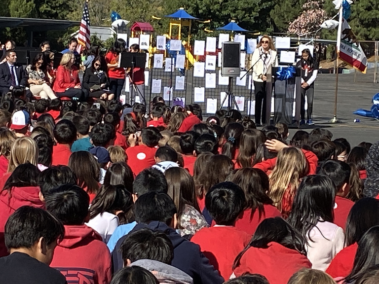 GUSD Board President Jennifer Freemon spoke to the students about the award. She asked them to raise their hands if they felt Monte Vista was an awesome place and they knew adults were there who cared about them. All students raised their hands.