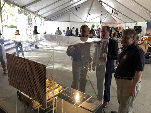 Larry James leads a tour, stopping at the MarCO cube, with Representatives Adam Schiff and John Culberson.