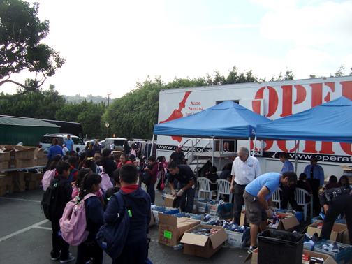 Operation School Bell, which includes volunteers from the Anne Banning Auxiliary of Assistance League of Los Angeles, partners yearly with Universal Studios’ Discover a Star Foundation to put on the Day of Giving event. Two hundred Universal Studios employees participated, from handing out backpacks to helping kids try on shoes to helping kids get school uniforms, all of which items were loaded inside Operation School Bell’s semi-truck on the premises.