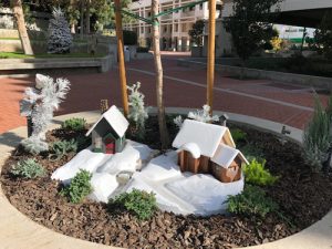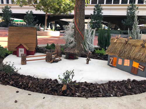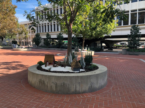For those who have not traveled down to the City of Glendale offices, these decorations are worth the trip. This year åThe warm lights that shine from the windows of the miniature houses are inviting and make visitors feel like they are walking through a small winter wonderland town. Each cylinder planter in the courtyard is filled with little glimpses of this wonderful world that Peplow creates.