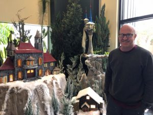Peplow’s hobby is woodworking. He loves to build and gets bored quickly, so he is always improving his ideas. For the first time, this year he added a mechanical aspect to his village – a ski lift with a red gondola climbing a mountain of snow. This is the part of the village that is inside the city hall lobby.