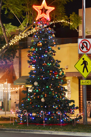 Traveling along the 2100-2400 blocks of Honolulu Avenue, in addition to the year-round festive lights visitors will see wreaths hanging from key intersections of the shopping park culminating with a 17 foot Noble fir at the southeast corner of Ocean View and Honolulu.