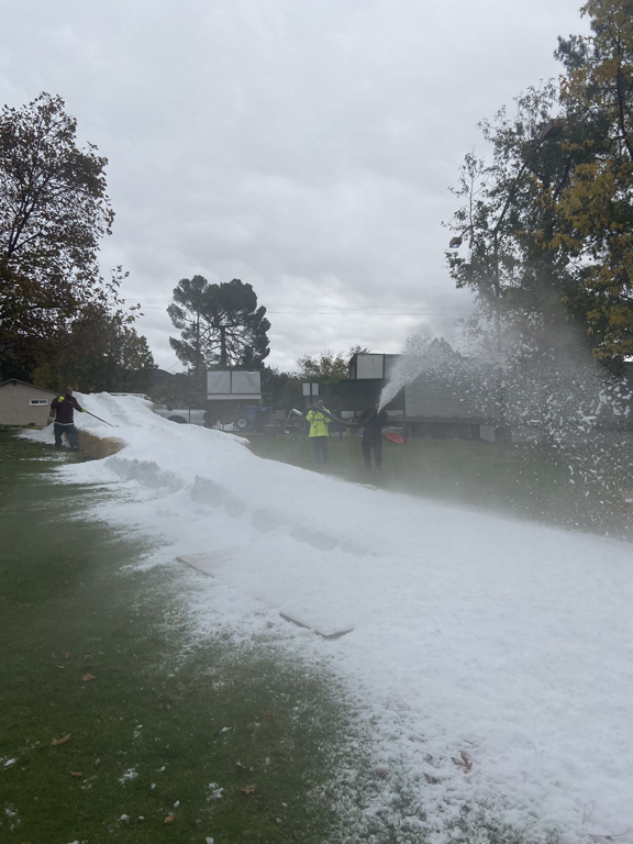Hay bales lined the park’s hillside as snow was shot out of hoses, making a thick layer down the slope. Kids, and some adults, slid down the snowy, sometimes icy, hill in sleds provided by the LA Parks and Rec.