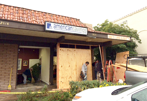 Workers install plywood after windows at American Savings on Honolulu Avenue were smashed when a woman lost control of her car on Tuesday.
