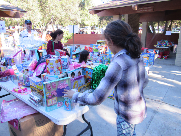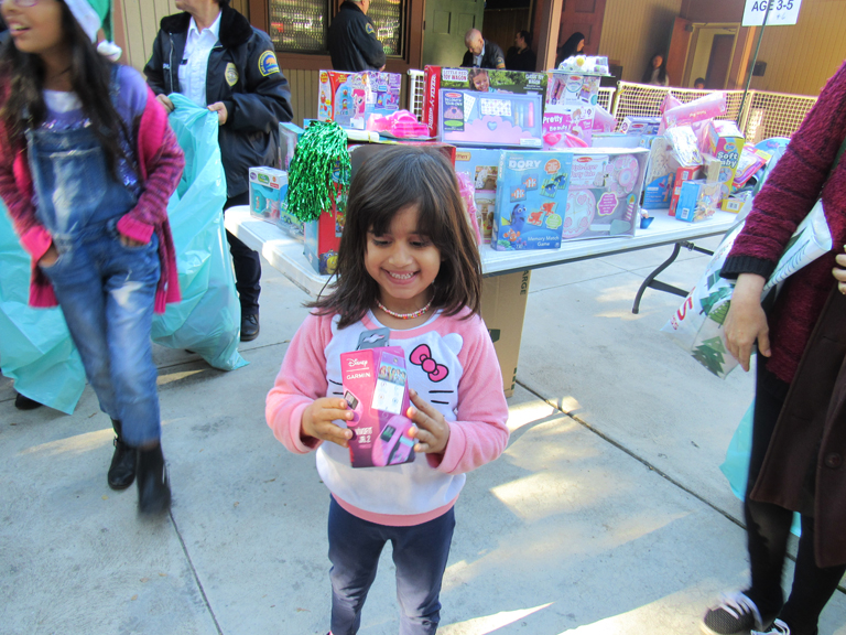 Families waited in a line as tables were filled with toys, from electronics to storybooks, for all ages. Each child chose two toys from one set of tables and one toy from the art or book tables. The morning started with a continental breakfast for families at Crescenta Valley Park’s community room. The kids then walked into a room with tables lined with stuffed animal toys ¬– and Santa. Each child chose one stuffed toy then visited Santa Claus.
