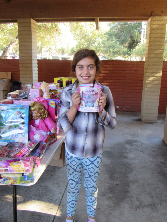 The kids walked into the courtyard to get their toys and, as the families left the event, were given groceries to help their holiday dinner table.