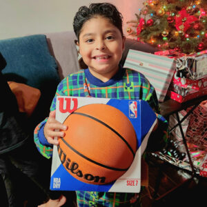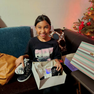 A few days before gifts are delivered, families receive trees to decorate. One family requested and received two trees – one white and pink for their daughter, the other green and red, the son’s favorite colors. The boy’s eyes sparkled as he held up a newly unwrapped basketball for his father to see before bouncing it all over the living room. His sister beamed at the sight of new sparkly black and pink shoes emerging from the Christmas wrapping.