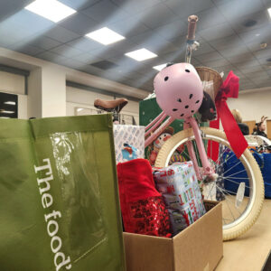 A little boy peeked out from behind an apartment door as officers and volunteers arrived at his home with a new bicycle and wrapped gifts. He told officers he was so surprised and shocked at the bicycle that he didn’t know what to say. His mother laughed and beamed with a bright smile as she unwrapped a blender under the tree.