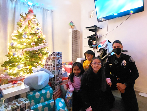 A family, with Officer Jamilah Jabali, gathers around a tree laden with gifts delivered by members and supporters of the Glendale Police Officers’ Association.