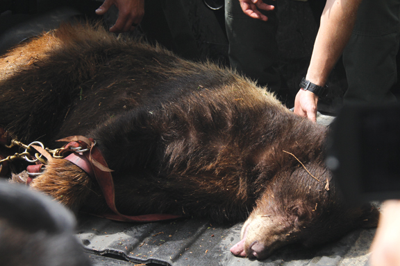 An adult female cinnamon bear took up residence in a tree on Burgoyne Lane just north of Foothill Boulevard in La Cañada. The California Dept. of Fish and Wildlife responded alongside the LA County Fire Dept. and the LA Sheriff’s Dept. to make sure the bear was safely removed and relocated.