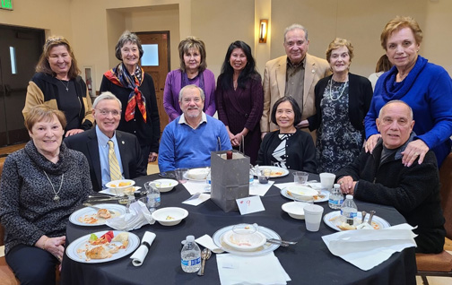 St. Bede officers and guests enjoyed a sumptuous lunch. Standing from left t are Phyllis Harb, elected president for a two-year term; Recording Secretary Gloria McGaughey, Second Vice President Lila Nastro, Trustees Robert and Jo Barbera (Ms. Barbera is the publisher of Italo-Americano, a national newspaper). Also standing are Leila Acedvedo. Seated are Corresponding Secretary and Membership Chairperson Diane Restivo, Orator and Communication Chairperson Al Restivo (Mr. Restivo served three past terms as far back as 1988 as president of the branch and is a currently LA Region Trustee of the LA District); Immediate two-term Past President Mark Mannarelli, and currently reelected treasurer; Emy Mannarelli, and First Vice President Raul Acevedo. Not pictured were Financial Secretary Robert De Pietro, and trustees Joel Wynton and Maria delSalguero.