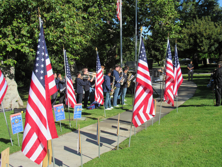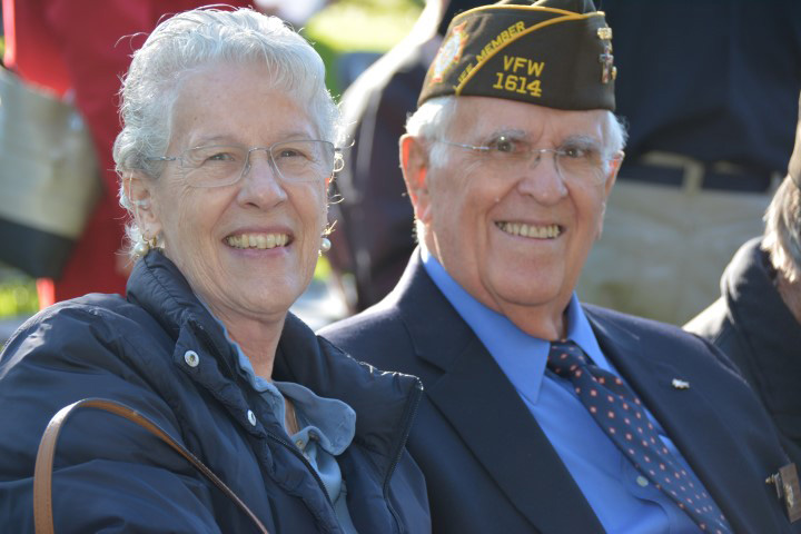 At the Two Strike Memorial Day observance, Darren Azarian presents a flag to WWII veteran Angelo Chairot in recognition of the sacrifice of his brother Roy.