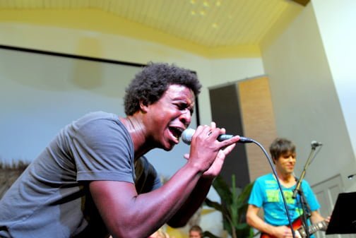 Singer Joel Simpson (left) and Petri Nauha perform at the church’s secular music event.